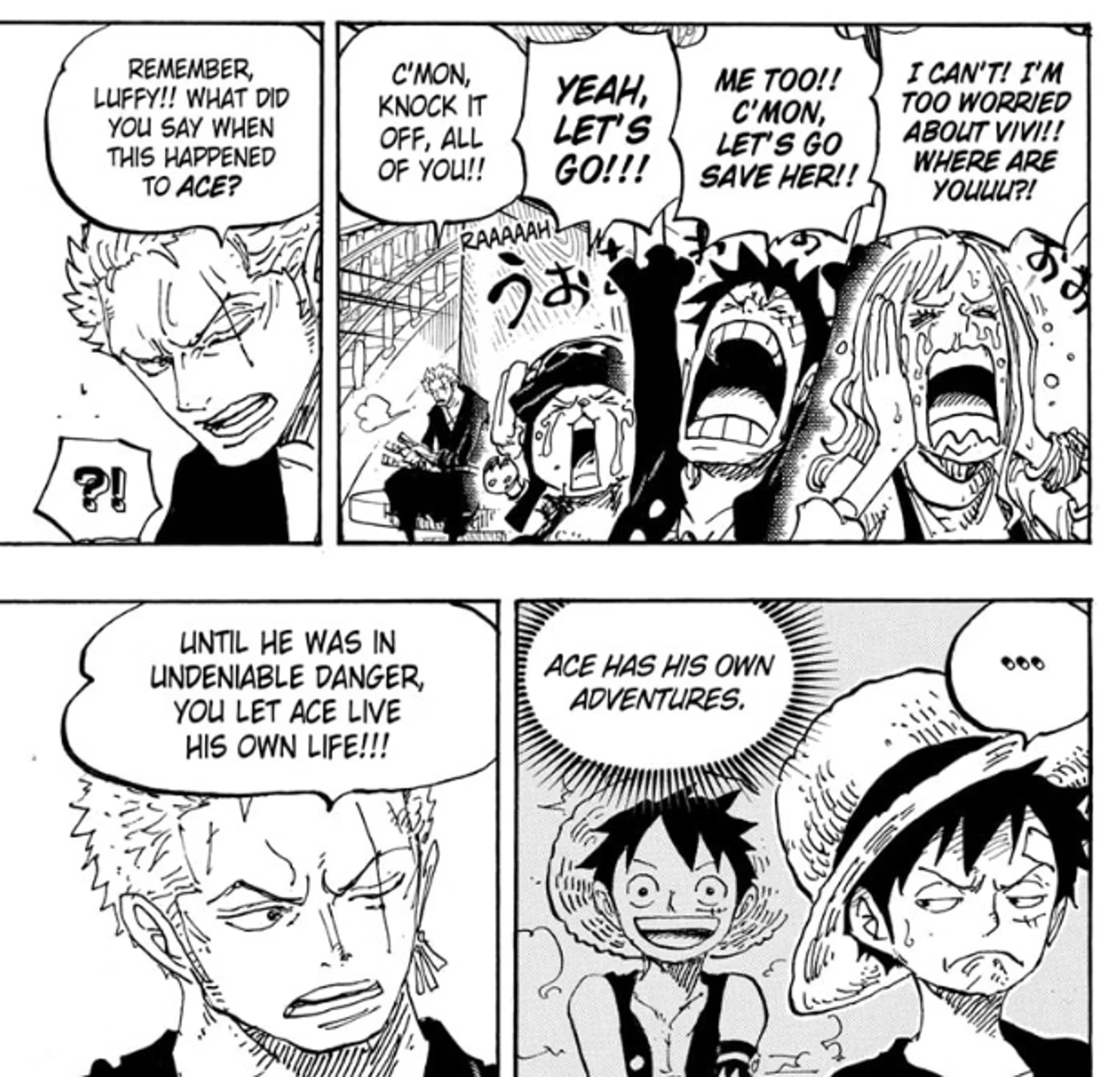 오랜 시간이 지난 후 루피는 에이스가 해병대 포로가 되어 처형을 앞두고 있다는 사실을 알게 되자 서둘러 도움을 청했지만 소용이 없었습니다. 흰수염 해적단의 힘도 에이스를 운명에서 구할 수 없었고, 루피는 동생의 죽음을 지켜보았다. 원피스 1060화 에서 조로는 스릴러 바크에서 루피의 초반 실수를 지적한다. 밀짚모자 선장은 전 선원이었던 아라바스타의 비비 공주 가 위험에 처해 있다는 사실을 막 알게 되자 해병대의 전력에 도전하는 대가를 치르더라도 서둘러 그녀를 구하려고 합니다. 그런 다음 Zoro는 Luffy가 에이스에 대해 말한 것과 실제로 도움이 필요할 때까지 자신을 관리하기 위해 자신을 믿었으므로 Vivi를 똑같이 신뢰해야한다고 상기시킵니다.