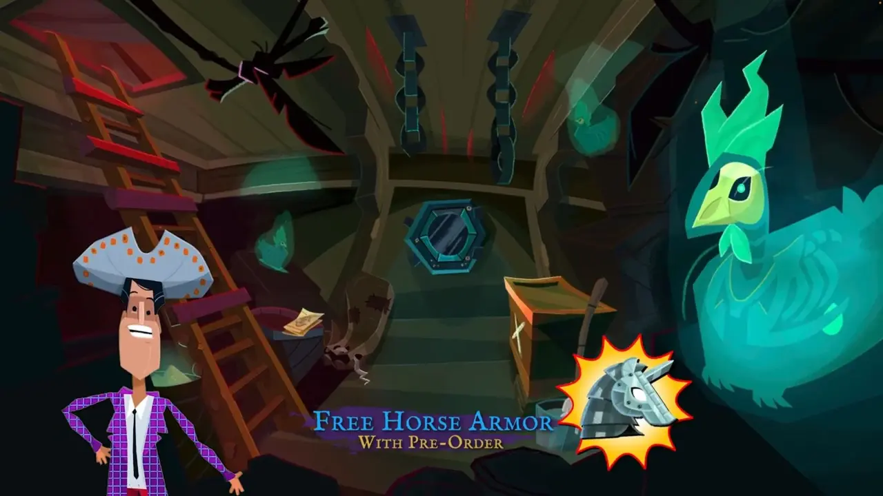 Return to Monkey Island에서 말 갑옷은 초기 출시일 이전에 이미 게임을 예약 주문한 경우에만 잠금 해제할 수 있습니다. 그렇게 했다면 가이브러쉬 의 해적 모험 으로 공을 굴리면 화면 왼쪽 하단의 배낭 아이콘으로 표시된 인벤토리에서 찾을 수 있을 것입니다 .