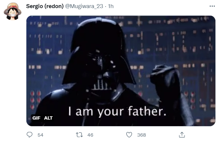 Redon이 게시한 원피스 1062장의 새로운 단서는 "나는 당신의 아버지입니다"라는 유명한 문구와 함께 다스 베이더의 gif입니다.