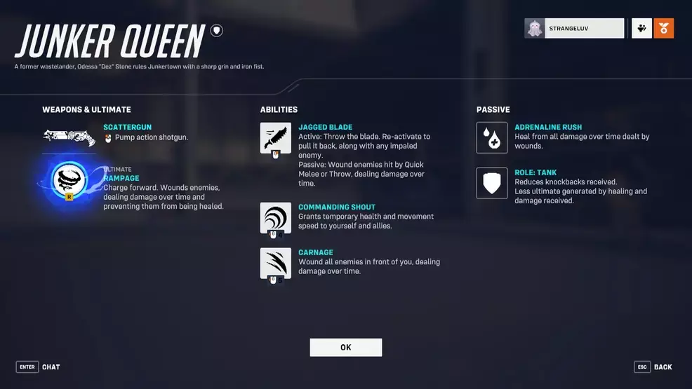- 광란(궁극기) – Junker Queen의 궁극기는 직선으로 앞으로 돌진하여 적을 갈가리 찢고 지속적으로 피해를 입히는 동시에 치유되지 않도록 합니다.