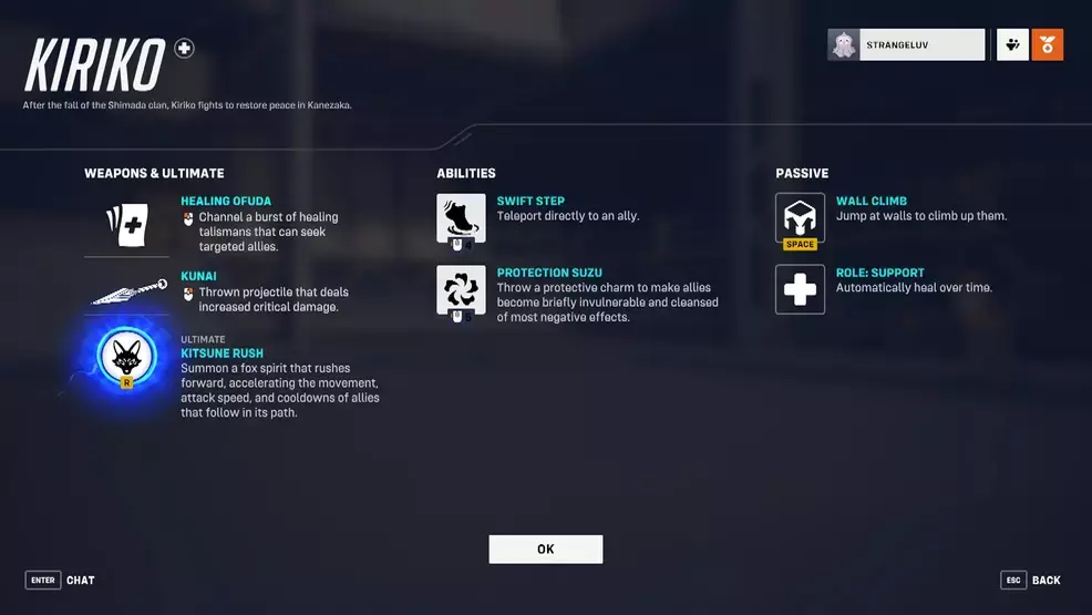 Kiriko는 이동성이 뛰어나며 쉽게 아군에게 접근하여 치유 및 버프를 지원합니다. 그녀의 쿠나이는 그녀가 전투에서 자신을 지킬 수 있게 해주지만, 키리코는 적과 안전한 거리를 유지하고 그녀의 능력을 활용할 수 있는 팀원들과 가깝게 지내는 것이 가장 좋습니다.