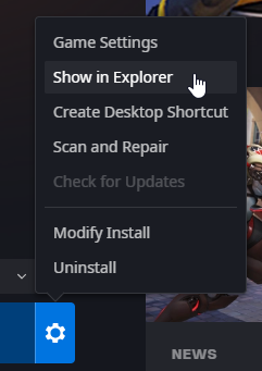 게임이 설치된 곳으로 이동합니다. 재생 버튼 옆에 있는 톱니바퀴를 클릭하고 탐색기에 표시를 선택하면 됩니다 .