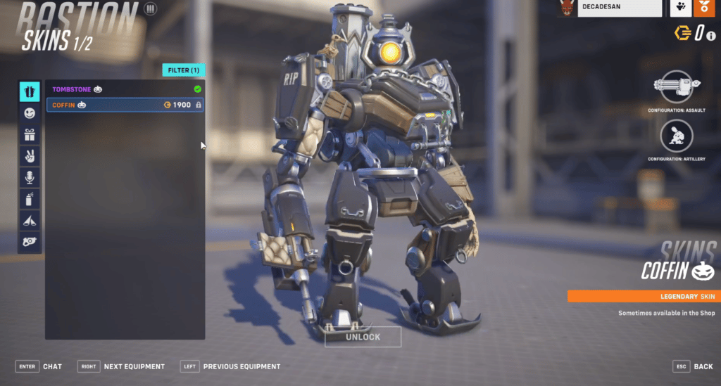 - Bastion은 실제로 Overwatch에서 가장 과소평가된 영웅 중 하나이며 그의 할로윈 스킨 중 하나는 Tombstone입니다. 그 위로 날아가는 새는 이제 그에게 접근하는 모든 사람에게 죽음을 의미하는 까마귀로 대체되었습니다.
