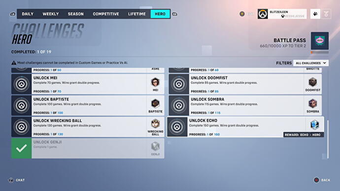 좋아하는 영웅이 100회 이상 플레이한 경우(죄송합니다. Echo 메인) 이것은 약간 성가신 일이지만, 2개의 게임을 플레이한 것으로 계산하여 승리 하면 조금 나아집니다 .