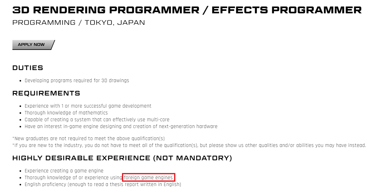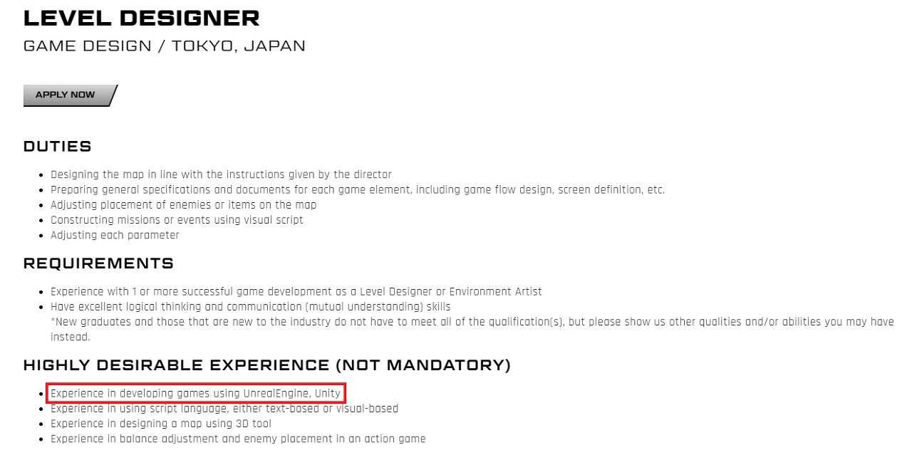 보시다시피, 설명은 Unreal Engine 및 Unity를 사용하여 게임을 개발한 경험을 매우 바람직한 경험 으로 선언합니다 . 이것은 언급된 다른 두 목록에서도 동일합니다. 이것은 게임이 어떤 엔진을 사용할 것인지를 나타내지는 않지만 "외국 엔진"의 바다에서 이 두 엔진을 선별합니다.