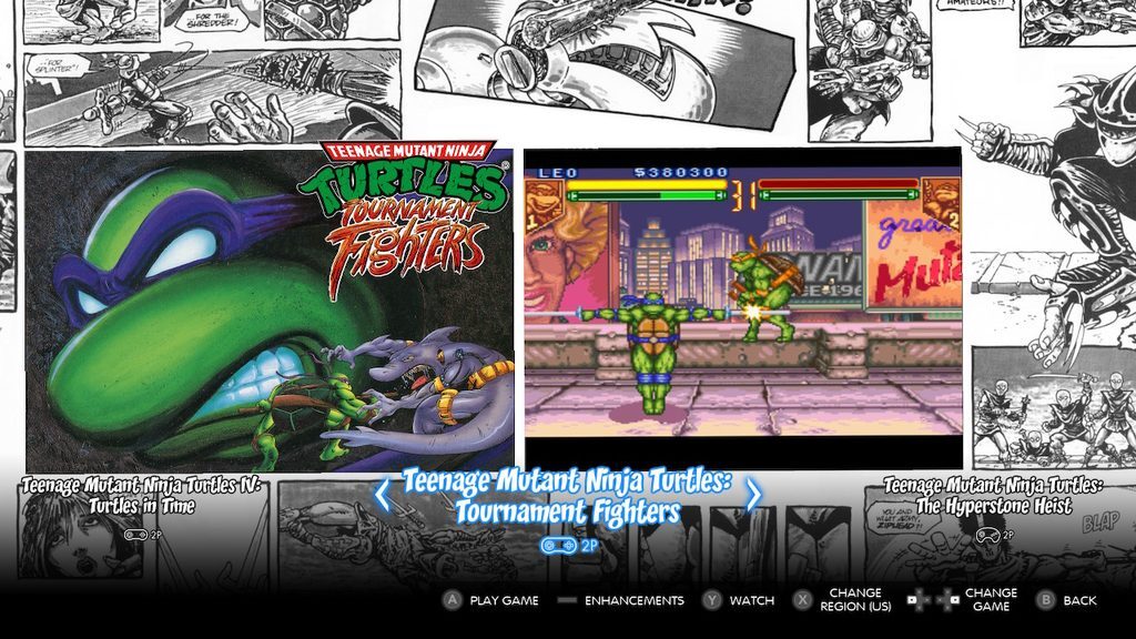 컬렉션의 하이라이트는 고전적인 격투 게임, 즉 Teenage Mutant Ninja Turtles 와 후속작인 Teenage Mutant Ninja Turtles: Turtles in Time 입니다. 이 두 게임은 수십 년 전에 처음 출시되었을 때와 마찬가지로 오늘날에도 즐길 수 있습니다. 오늘날의 표준에서는 단순하지만 몇 시간 동안 아무 생각 없이 버튼을 누르는 재미를 쉽게 제공할 수 있습니다.