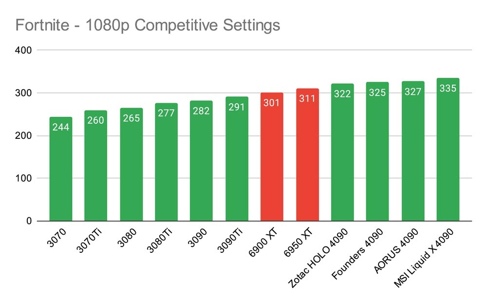 Fortnite에서는 설정을 경쟁 모드로 되돌려 시야 거리를 늘리고 CPU와 GPU의 오버헤드를 유발하는 구성을 낮추어 최상의 프레임 출력을 얻을 수 있습니다. 우리는 테스트한 다른 모든 GPU를 능가하여 평균 프레임 속도 327에 도달할 수 있었습니다. 이것은 매우 인상적이며 우리가 Victory Royale에 필요한 헤드샷을 착륙할 수 있게 해주었습니다!