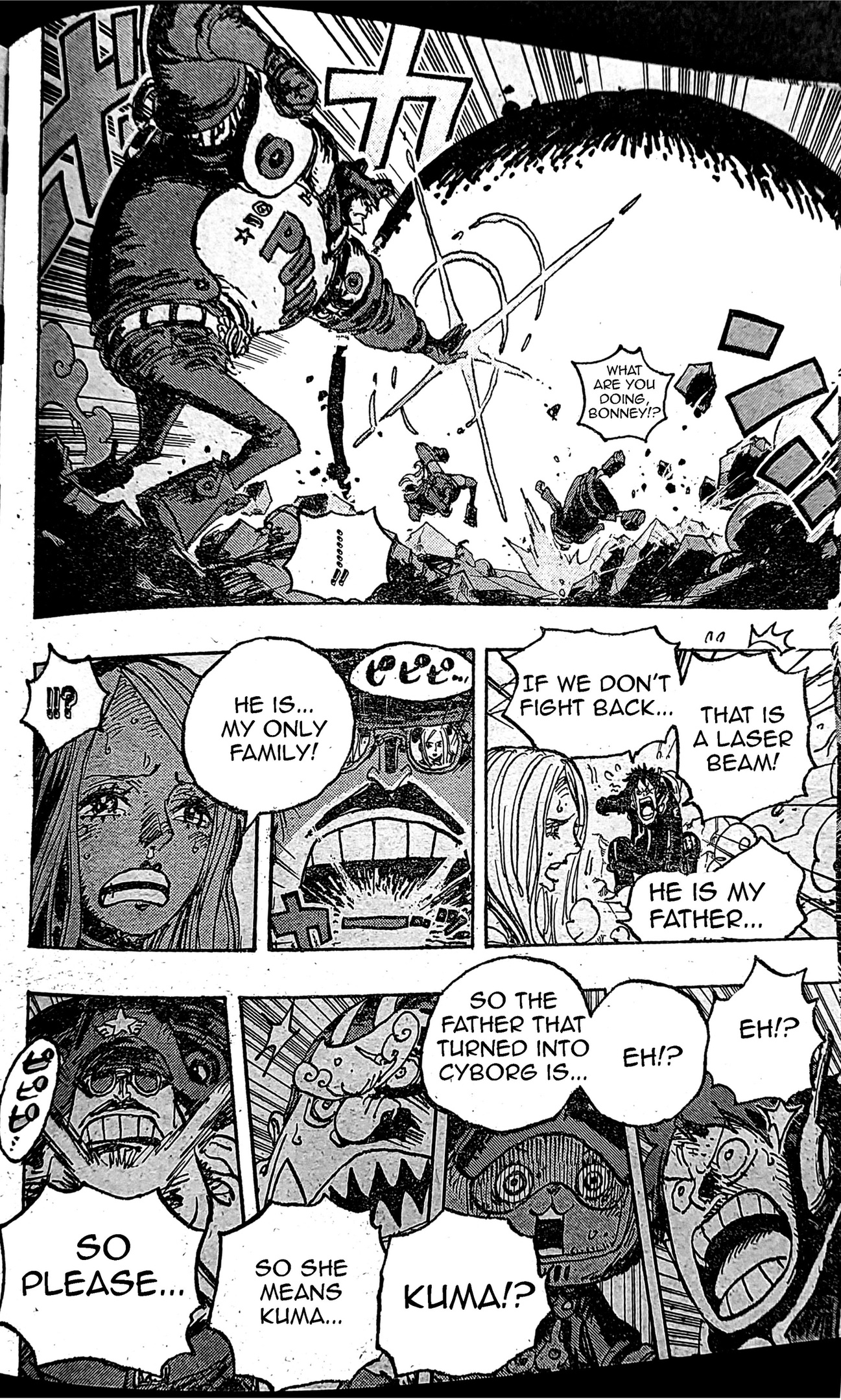 보니는 루피에게 쿠마를 다치게 하지 말라고 울부짖는다. 그에 따르면 쿠마는 그의 아버지이자 유일한 가족이기도 하다. 이것은 또한 루피와 다른 사람들을 놀라게 했습니다. 그들은 Kuma가 Bonney의 아버지라고 생각하지 않습니다. 루피 자신은 쿠마가 더 이상 인간이 아니라 파치스타라고 생각한다. 그리고 패널 중 하나에서 Luffy는 Kuma의 레이저 공격에서 Bonney의 생명을 구했습니다.