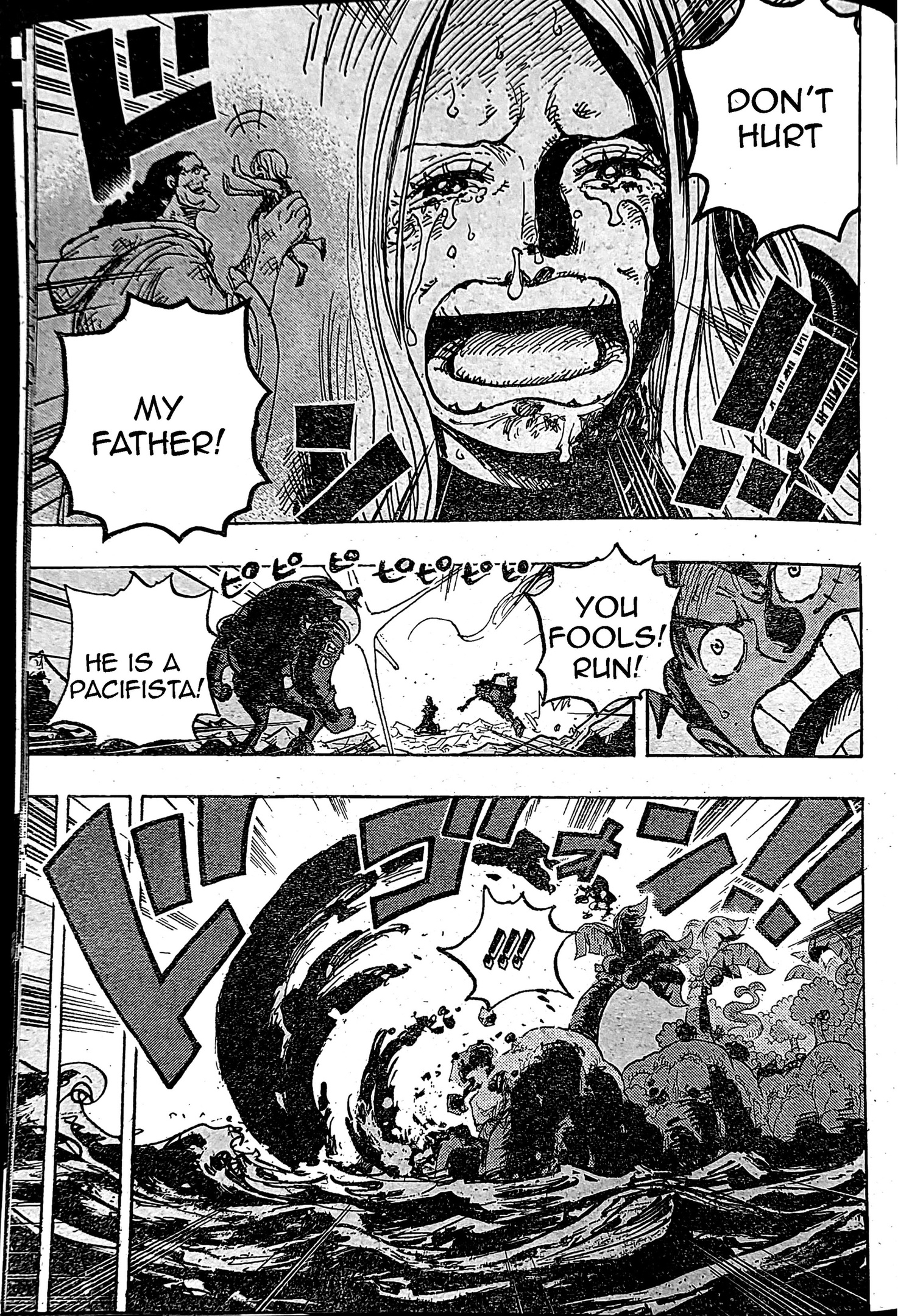 보니와 루피 일행이 수행한 잠입 임무는 완전히 실패했다. 그들은 "구매"한 옷과 먹은 음식에 대한 비용을 지불하지 않아 구마 경찰에 의해 적발되었습니다. 파시피스타 쿠마는 레이저 공격으로 그들을 전멸시키려 했다. 그리고 우리는 거대한 폭발이 그 지역의 일부를 파괴하는 방법을 봅니다.