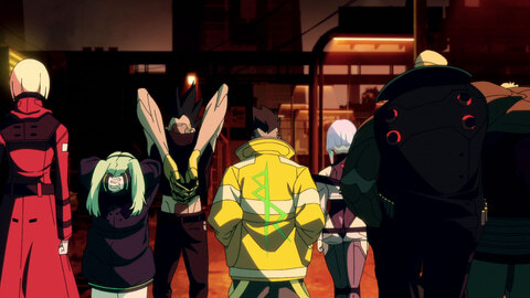 데이비드는 수수께끼의 넷러너 루시와 그녀의 동료인 메인이 이끄는 사이버펑크팀에 합류해 새로운 인생을 걸어간다. 한 일 쫓은 팀이 술을 마시는 곳은 웨스트브룩 지구의 재팬타운 북서쪽에 있다. 또, 플래시백적인 회상 장면에서 등장하는 일의 많은 것은 「사이버펑크 2077」의 ACT1의 장면과 겹치는 장면도 많아, 게임을 플레이하면 눈치채는 장면도 많을 것이다.