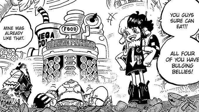 그럼에도 불구하고 원피스 1063화는 공식적으로 내가 가진 유일한 가족 이라는 제목 으로 부풀려진 쵸파, 루피, 보니로 이야기 내용을 시작합니다. 세 사람 모두 무인 요리 기계를 칭찬하고 있으며, 루피는 모두가 어디 있는지 궁금해하고 쵸파는 "아마도 상디를 제외하고는 모두가 기계를 좋아할 것"이라고 말했습니다.