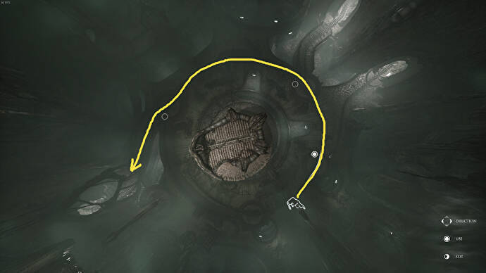 다음 방에서 왼쪽을 유지하고 여기 터널을 통과하고 싶을 것입니다. 당신이 나올 때, 당신은 아직 상호 작용할 수 없지만 나중을 위해 기억할 수 있는 원형 받침대가 있는 기둥을 볼 것입니다.