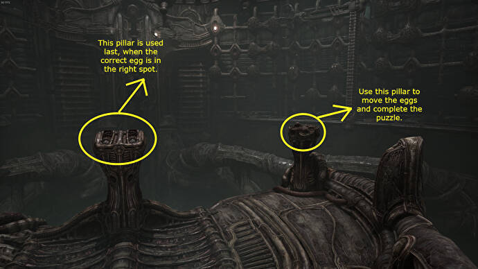 오른쪽 기둥은 흥미로운 부분입니다. 이 가이드에서는 작고 움직일 수 있는 조개껍데기 같은 물건을 알이라고 부를 것입니다. 그것이 달걀인지, 껍질인지, 아니면 다른 무엇인지는 모르겠지만 명확성을 위해 달걀이라고 부릅니다. 이 가장 오른쪽 기둥을 사용하면 광선을 따라 알을 다른 방향으로 이동할 수 있습니다. 일부 계란은 다른 계란에 붙어 있으며 빔을 따라 일부 특정 공간은 사용할 수 없습니다. 이 퍼즐의 목표는 특정 알(아래 표시)을 발톱이 활성화되었을 때 잡으려고 하는 공간으로 가져오는 것입니다.