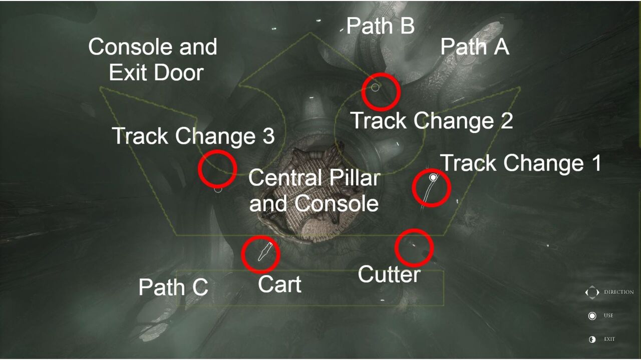 여기에서 중앙 기둥의 경사로를 올라가 여기 있는 큰 구체 콘솔과 상호 작용할 수 있습니다. 이렇게 하면 지도의 조감도로 이동하고 트랙 변경 1이 경로 A에서 떨어져 정렬되고 트랙 변경 2가 경로 B로 연결되는지 확인하려고 합니다.