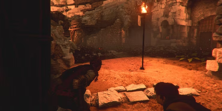 막대기에 불을 붙이고 오른쪽으로 이동 하여 계단을 올라갑니다. 다른 경비원이 해당 지역을 순찰할 것이지만 엄폐를 위해 난간 뒤에 숨 을 수 있습니다 .