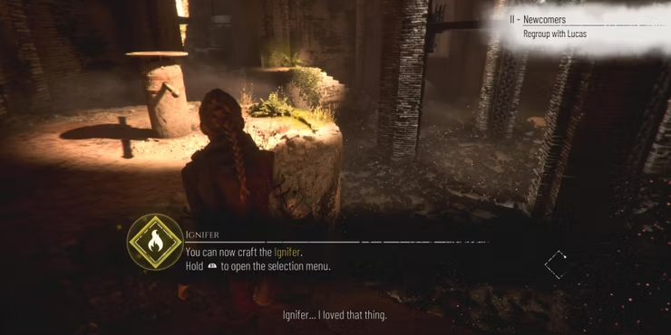 알코올 과 유황 으로 이제 이그니퍼를 제작할 수 있습니다. 사다리를 타고 올라가면 Lucas가 Ignifer를 섞는 방법을 알려줄 것입니다. 무기 휠 을 열어 Ignifer를 만들고 새총과 함께 사용 하여 방 중앙에 있는 화로를 쏘십시오 .