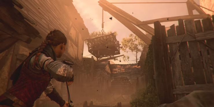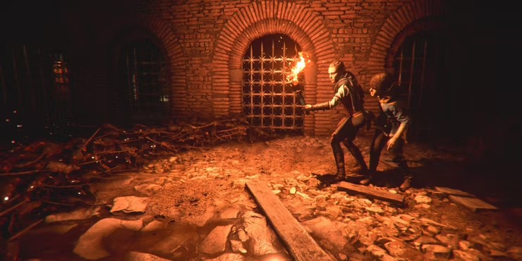 난간에서 떨어질 때 플랫폼은 Amcia와 Lucas의 무게로 인해 무너질 것입니다. 수백만 마리의 쥐가 Amcia와 Lucas를 쫓기 시작하고 당신이 그들을 막으려 할 때 그들은 벽을 부수기 시작할 것입니다.
