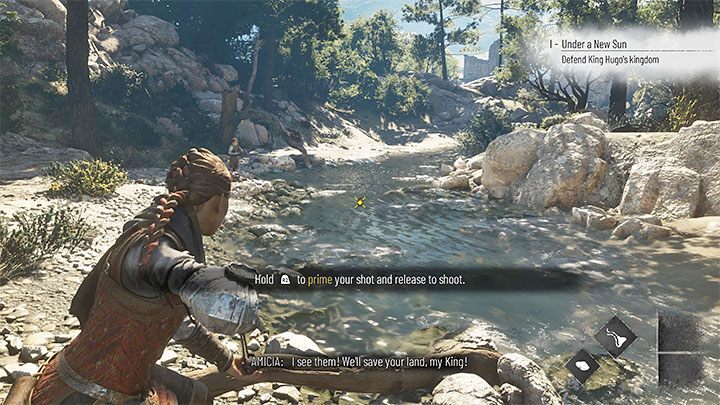 휴고와 함께 폐허의 다음 부분으로 가다가 강으로 가십시오. 통나무 앞에 서 십시오. 새총 튜토리얼 시간입니다. 새총 으로 떠다니는 물체를 때려야 합니다. 조준 버튼(컨트롤러의 L2/LT)과 발사 버튼(컨트롤러의 R2/RT)을 누르고 있으면 더 정확하고 강한 샷이 가능합니다.