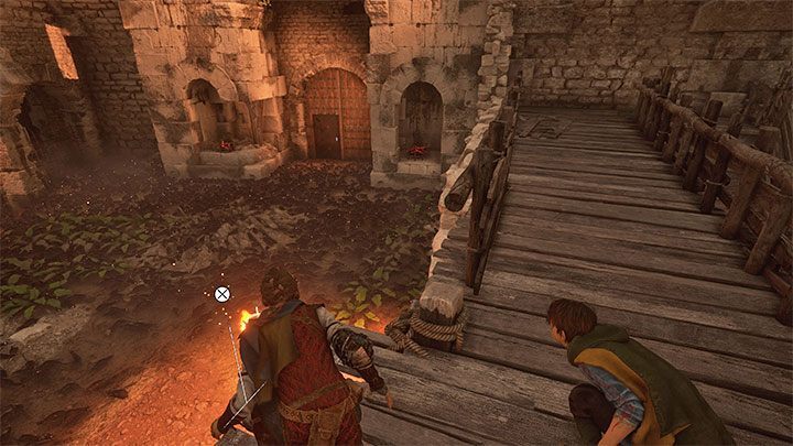 다음 지역 에서는 화재로부터 도망쳐야 합니다 . 폐허를 향해 달려가 벽의 구멍을 통해 안으로 들어갑니다. 컷신이 끝나면 위로 올라가서 뛰어내립니다.