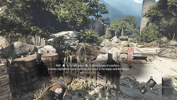 오두막을 떠난 후 처음으로 적의 주의를 분산시켜야 합니다 . 빠른 메뉴(컨트롤러의 R1/RB)로 들어가 돌을 선택하고 왼쪽 도구 상자에 던지십시오 . 이 기회에 몰래 지나가세요.