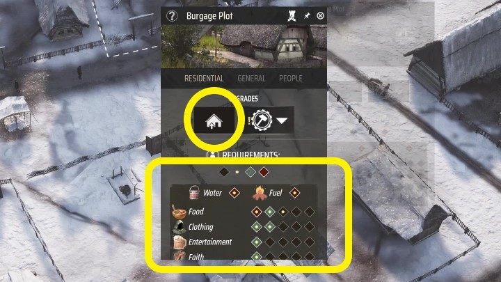 burgage 플롯은 레벨 2로 업그레이드할 수도 있습니다 . 그러나 먼저 따라야 하는 여러 규칙이 있습니다. 건물 정보 상자 하단에서 확인할 수 있습니다. 빨강 및 녹색 다이아몬드는 집을 업그레이드하기 전에 충족되어야 하는 거주자의 요구를 상징합니다. 빨간색 필드 는 최소한의 것으로 연결되어 있으며 이러한 요구 사항을 충족하지 못하면 시민의 불만과 죽음을 초래할 수 있음을 강조할 가치가 있습니다. 흰색 점은 조건이 충족되었음을 나타냅니다 .