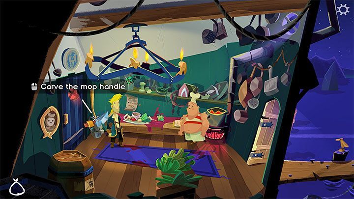 요리사는 식사 준비를 시작할 것입니다. 이것은 그를 산만하게 할 것입니다. 인벤토리에서 칼 (Voodoo Lady에게서 구입한 칼)을 선택 하고 걸레에 사용합니다 . 덕분 에 나무 조각을 얻을 수 있습니다 .
