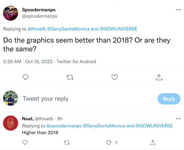 게다가 갓 오브 워 라그나로크의 파일 크기가 공개된 것 외에도 게임 테스터인 노엘(NoeL)은 게임 성능에 대해 " 지금까지는 너무 좋다 "고 평했다 . 타이틀이 PlayStation 4에서 어떻게 실행되고 그래픽이 2018 God of War보다 더 좋아 보이는지에 대한 질문에 NoeL은 다음과 같이 말했습니다.