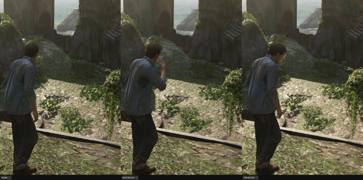 공격적인 Ultra Performance 사전 설정에서 FSR 2.0은 더 먼 뒷자리를 차지합니다. 공정하게 말하면 DLSS와 FSR 2.0 모두 Ultra Performance 사전 설정으로 약간 거칠게 보이지만 FSR 2.0은 훨씬 부드럽습니다. 위의 스크린샷에서 Nathan Drake 주변의 닳은 가장자리를 볼 수 있습니다. 이는 DLSS로 사전 설정되지 않았습니다. 그러나 기본 해상도와 비교하면 이 사전 설정에서 DLSS와 FSR이 얼마나 세부적으로 제거되는지 알 수 있습니다.