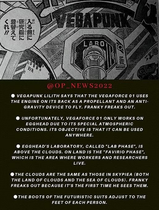 따라서 Sanji의 일행은 Lilith와 함께 Vegapunk Shaka를 만나기 위해 가고, 일행은 Lilith의 Vegaforce 01을 타고 그곳에 도착합니다. Vegaforce 01이 작동하는 이유는 뒷면에 있는 엔진과 반중력 장치로 인해 Franky가 기절할 수 있기 때문입니다. 그녀는 독특한 대기 조건으로 인해 현재 Egghead Island에서만 작동한다고 설명하지만 보편적으로 작동하도록 노력하고 있음을 강조합니다.