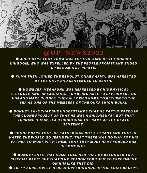 Jinbe는 Bonney의 아버지인 Bartholomew Kuma가 한때 "Sorbet 왕국의 사악한 왕"이었고 결국 그의 백성에 의해 추방되어 해적이 되었다고 설명합니다. 그 후 혁명군에 입대하여 해병대에 체포되어 사형을 선고받았다.