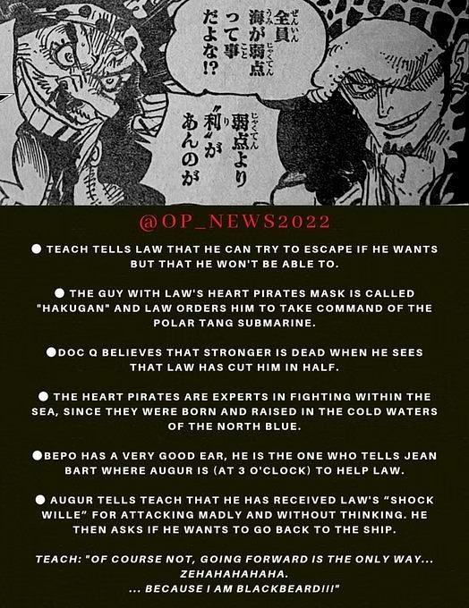 원피스 1064화는 두 크루의 싸움으로 돌아가는데, 로우는 검은 수염의 모든 지휘관이 악마의 열매를 사용하는 물에 약하다는 점을 지적한다. 본질적으로 이것이 명백한 약점이며 악마 과일의 바로 그 특성이 이점이 이 단일 비용보다 더 크다는 점에 반대한다고 가르칩니다.