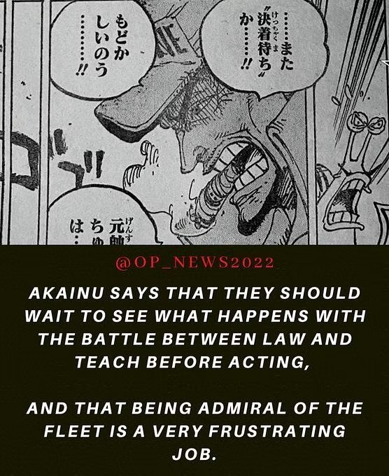 검은 수염 해적단은 심장 해적단 이 배가 침몰할 것을 두려워하여 예상보다 바다에서 훨씬 더 강하다고 언급합니다. 원피스 1064장에서 아카이누가 상황을 보고받는 것을 보고 Law와 Blackbeard는 충돌하고 여기에 갇히게 됩니다. 그는 그들이 움직이기 전에 어떤 일이 일어나는지 지켜봐야 한다고 말합니다. 그는 또한 Fleet Admiral이 얼마나 실망스러운 직업인지에 대해 언급합니다.