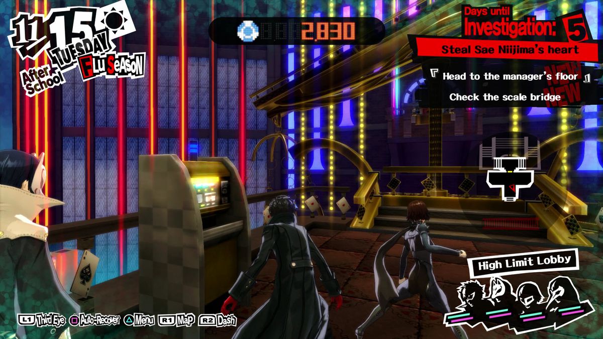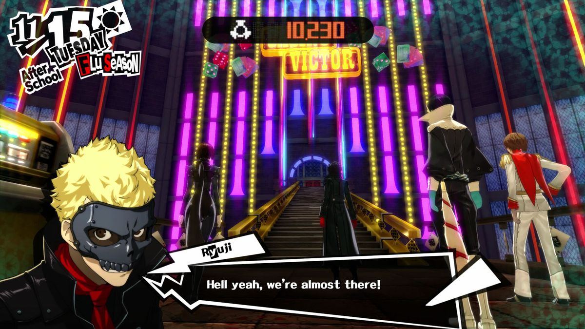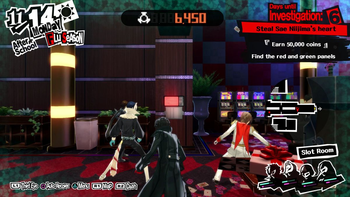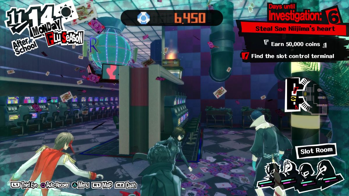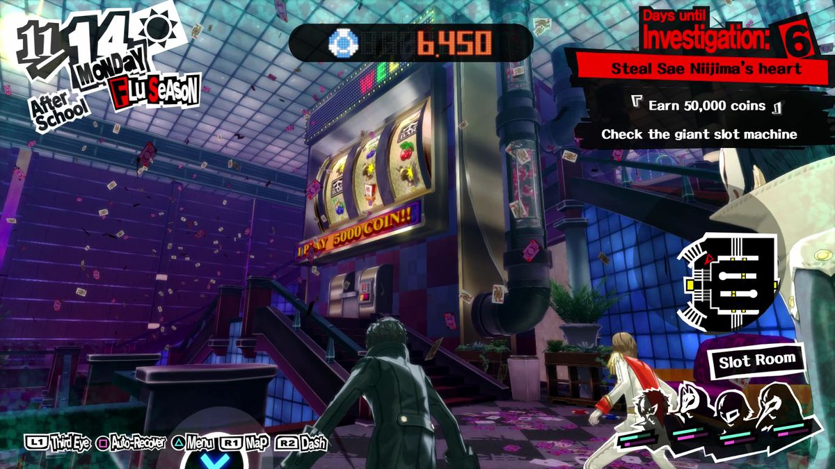 게임 마스터에게 다가가 " 3-10 사이 "에 베팅하십시오 . 이 작업을 네 번 수행하면 약간의 동전을 얻을 수 있습니다. 당신의 상금을 가지고 주사위 게임 영역을 떠나려고합니다. Akechi는 어떻게 든 팀을 위해 많은 추가 동전을 얻을 것입니다. 해당 지역을 떠나 슬롯 지역으로 곧장 걸어갑니다.