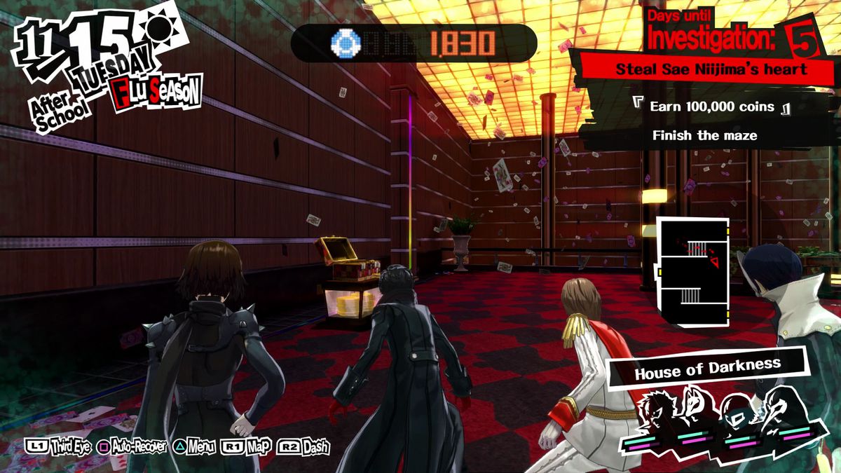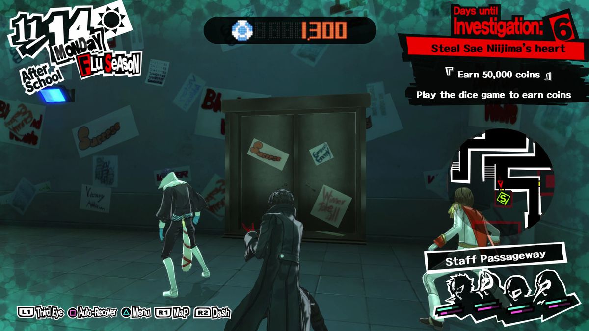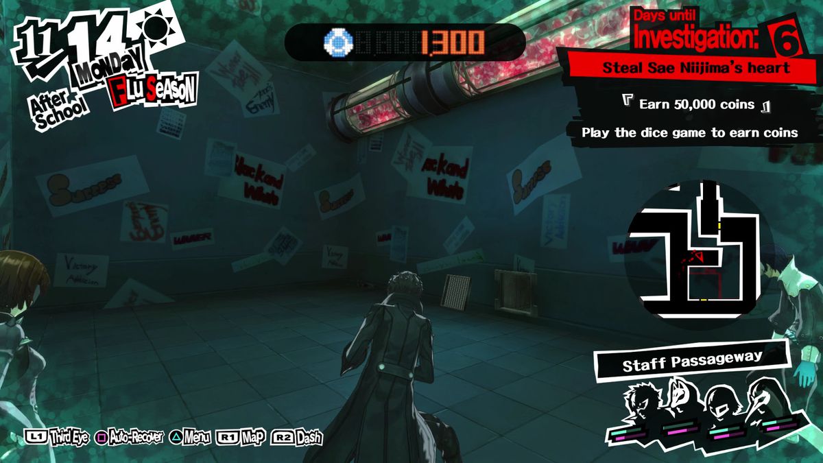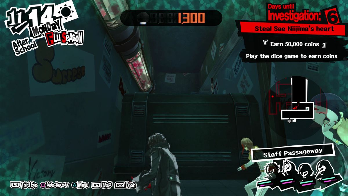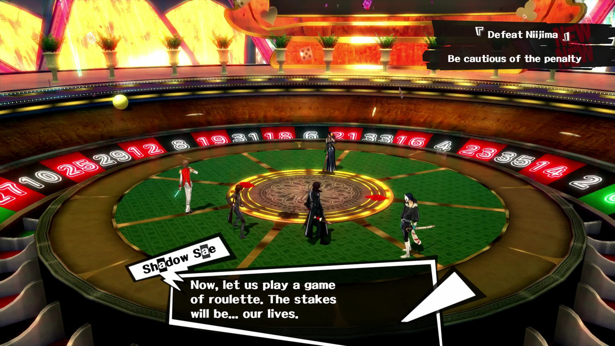 게임 마스터에게 다가가 " 3-10 사이 "에 베팅하십시오 . 이 작업을 네 번 수행하면 약간의 동전을 얻을 수 있습니다. 당신의 상금을 가지고 주사위 게임 영역을 떠나려고합니다. Akechi는 어떻게 든 팀을 위해 많은 추가 동전을 얻을 것입니다. 해당 지역을 떠나 슬롯 지역으로 곧장 걸어갑니다.