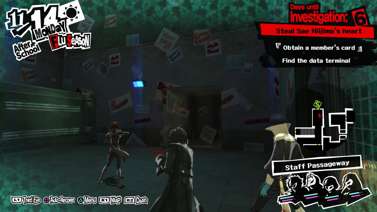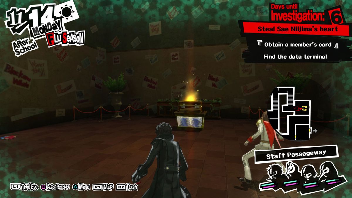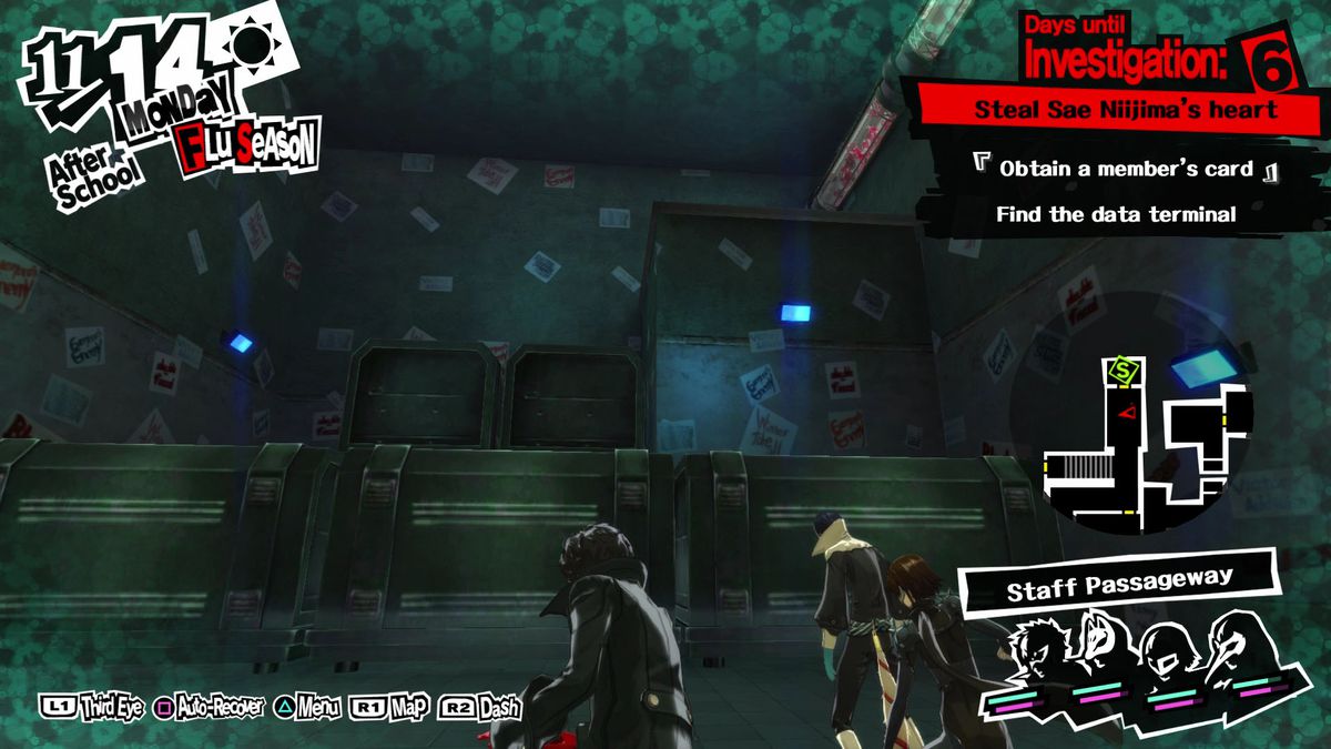 계단에서 오른쪽으로 나와 왼쪽에 있는 키카드 문으로 가십시오. 여기에서 Sae가 탔던 엘리베이터로 돌아갑니다. 엘리베이터에서 키 카드를 사용하여 Member's Floor 로 올라갑니다 .