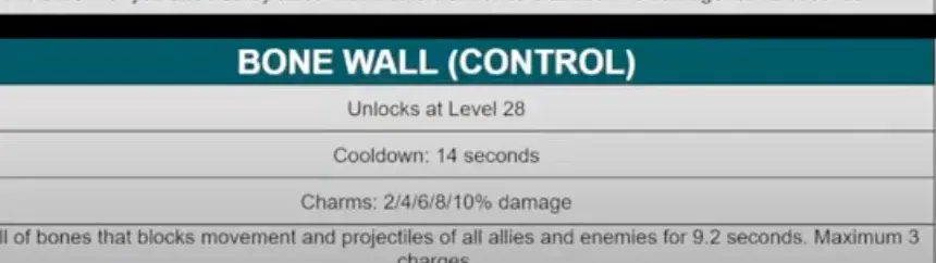 "컨트롤 기반" 기술이 필요한 기술의 경우 뼈로 이루어진 벽을 만들어 들어오는 적의 공격을 계속 차단할 수 있을 때 Bone Wall이 등장합니다. 데미지 출력이 아무리 강력해도 9.2초 동안 발사체가 통과할 수 없습니다.