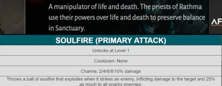 주로 플레이어를 지원하기 때문에 플레이어는 시전할 때마다 에너지로 채워지는 소울파이어 볼을 방출할 수 있습니다. 대상 적에게 도달하면 폭발하여 피해를 입히고 반경 내에 존재하는 적에게 기본 공격력의 25%를 입힐 수 있습니다.