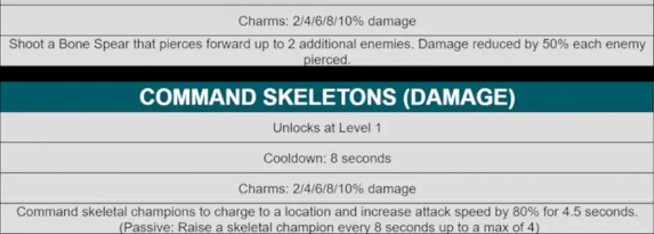 이를 통해 커맨드 스켈레톤 패시브는 스켈레탈 캡틴을 소환할 수 있는 능력을 제공하여 적에게 돌진하고 적들을 뒤쫓아 없애버릴 것입니다. 전체 HP를 줄임으로써 캡틴을 적의 해당 위치로 회오리바람을 일으켜 쓸모 없게 만드는 것이 훨씬 쉬워집니다.