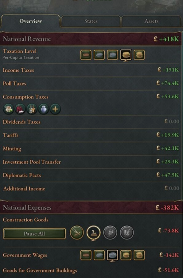 빅토리아 3에서 생활 수준을 높이는 또 다른 방법은 인구에 대한 세금 을 낮추는 것입니다. 인구에 부과되는 세금을 줄이면 다른 필요에 지출할 돈이 더 많아지고 경우에 따라 더 많은 돈이 남게 됩니다. 이 금액은 국가의 부(富)에 기여할 뿐만 아니라 생활 수준도 높일 것입니다.