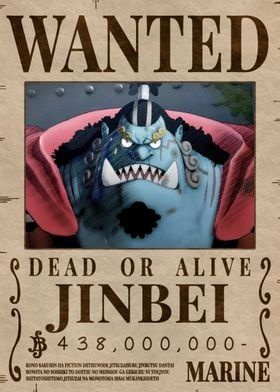 Jinbe는 고래, 상어의 잡종으로 어떤 종류의 다른 물고기와 남자의 잡종이며 Fish-Man Karate의 강력한 마스터입니다. 그는 Strawhats에 마지막으로 합류했으며, 이전에 Sun Pirates 의 일원 이었고 그곳에서 그의 현상금이 1위를 차지했습니다. 나중에 그는 모든 것을 버리고 이 새로운 그룹에 합류하여 11억의 새로운 현상금을 수여했습니다.