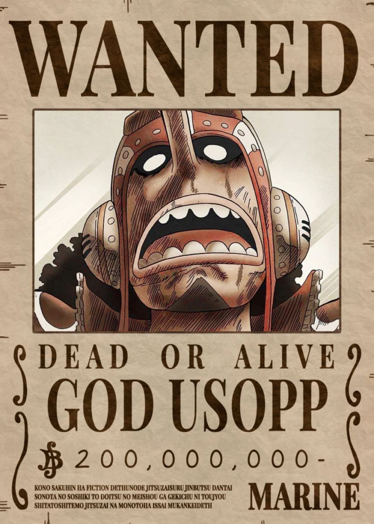 우솝은 밀짚모자 일당의 저격수이자 밀짚모자 대함대의 9명 중 한 명입니다. Nami와 마찬가지로 Usopp도 Onigashima의 습격 사건 이후 현상금이 크게 증가하여 현재 5억에 도달했습니다.