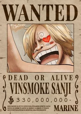 처음에 Sanji는 Enies Lobby의 이벤트와 CP9의 Jabra를 꺾고 현상금 77,000,000를 받았습니다. 그러나 그를 많이 슬프게도 Sanji의 포스터에는 그를 거의 닮지 않고 한때 다른 사람을 곤경에 빠뜨렸던 그의 스케치가 있습니다. 그 후 그의 현상금이 크게 증가하여 현재 10억 3200만 달러에 달합니다. 불행히도, 그는 그의 성을 비난했기 때문에 그의 이름이 잘못 언급되었지만 포스터에는 그들이 있습니다.