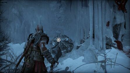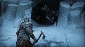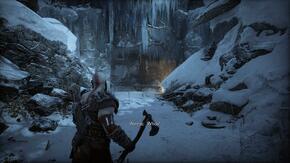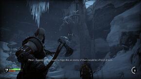 꿈 시퀀스 동안 주인공을 다시 제어할 수 있게 되면 Faye를 따라 숲을 가로질러 가면 됩니다. 걷고 이야기하고 난간을 한두 개 오르면 끝입니다. 이제 제대로 된 게임에 들어갑니다. 당신의 목표는 Atreus를 찾는 것이며 이제 Kratos를 완전히 통제할 수 있습니다. 원하는 경우 근처에 있는 상자를 부술 수 있습니다. 애완용 늑대가 있는 곳으로 내려가서 도끼로 방해가 되는 얼음을 부수고 나서 늑대 옆에 있는 틈을 짜내십시오.