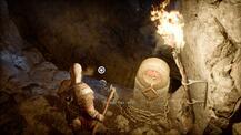 이것은 선형 영역이므로 경로를 따라가면서 풍경을 뛰어 넘습니다. 두 번째 통나무를 뛰어 넘으면 원주민 전사의 공격을 받게 됩니다. 이것은 당신의 첫 전투 조우이며 적의 레이더 는 상당히 약합니다. 이를 기회로 크레토스의 움직임에 익숙해지고 적에게 둘러싸여 있지 않도록 하세요. 승리하면 근처의 통나무를 들어 올려 다음 지역으로 이동하십시오. 필요한 경우 여기에 건강 돌이 있습니다. 근처에 있는 죽은 곰을 조사하고 계속하십시오. 여기에서 피를 따라갈 수 있지만 동굴 오른쪽에 작은 보물 상자가 있습니다. 쓰러진 나무에 이르면 도끼로 나무를 부수고, 틈의 반대편으로 점프한다.