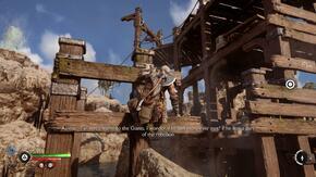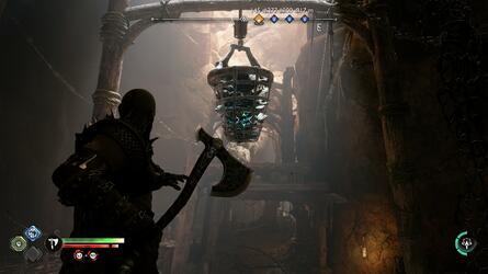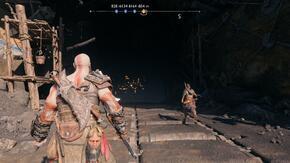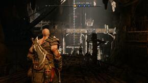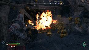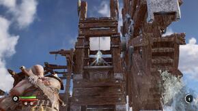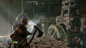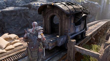 불행히도 여정은 순조롭지 않으며, 그 과정에서 QTE에서 많은 적들을 물리쳐야 합니다. 그리고 기차에서 내려도 더 많은 그림 들이 당신을 기다리고 있습니다. 아래쪽 플랫폼에는 내부에 Hacksilver 가 들어 있는 상자 가 있으며 오른쪽에는 다리가 있습니다. 이 다리는 Atreus에게 방해가 되는 녹색 장애물에 소닉 애로우를 발사하도록 지시하여 접근할 수 있습니다. 가스통을 폭발시켜 드워프 건물로 통하는 문을 엽니다.