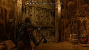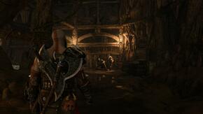 물의 흐름을 동결시켜 큰 바위 플랫폼을 내린 다음 그 쪽으로 점프하세요. 정상에 오르면 도끼를 회수하여 다음 단계로 올라갑니다. 아트레우스가 문을 열 수 있도록 도와주세요. 수레를 치워두고 신드리와 만나십시오. 물론, 그가 당신에게 횃불을 준 후에 당신은 새로운 적 유형인 Draugr 을 포함하여 즉시 기습을 당할 것 입니다. 여기 주변에 상자가 몇 개 있으므로 원하는 경우 상자를 열고 광산 안으로 들어가십시오. 조심하세요, 여기 안에 Wretches 가 있습니다. 왼쪽에 있는 동굴 바로 전에 들어가야 합니다.