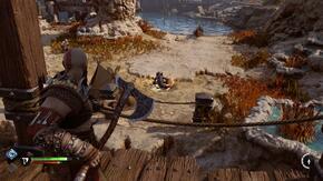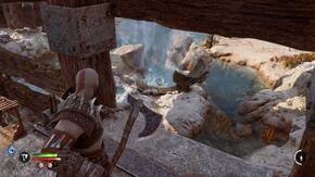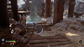 결국 길을 막고 있는 바퀴로 항해하게 되므로 흰 깃발로 표시된 오른쪽 근처 해변에 정박하세요. 길을 막고 있는 간헐천이 있지만 물줄기 바닥에 도끼를 던져 얼릴 수 있습니다. 오른쪽에는 Nornir 상자 와 유물 이 있습니다. Nornir Chest 위의 통로를 발견하려면 간헐천을 얼려 야 합니다 . 안에 Idunn Apple 이 있습니다. 다시 메인길로 돌아와 목조건물을 올라갑니다.