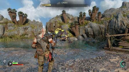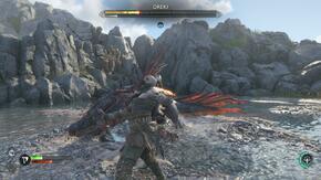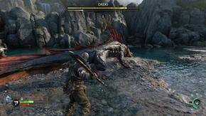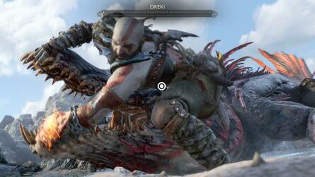 전투가 진행됨에 따라 Dreki는 전류를 소환하기 시작합니다. 이 스턴 락 Kratos가 그들에게 잡히면, 적이 돌진할 때와 땅에 침을 뱉을 때 굴러가는 것을 피해야 합니다. 충분한 피해를 입힌 후 R3로 적을 제압할 수 있습니다. 그가 활을 사용하는 동안 컨트롤이 일시적으로 Atreus로 전환되므로 총을 쏘고 야수를 쓰러뜨리십시오. 고뇌의 불꽃 이라는 새로운 가벼운 룬 공격 을 위해 시체를 약탈하는 것을 잊지 마십시오 .