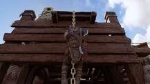 이제 닻을 고정하고 있는 금속판에 도끼를 던져 앞으로 나아가 앞서 언급한 게이트를 열고 체인 절반을 당길 수 있습니다. 다른 체인을 찾아야 합니다. 왼쪽으로 틈을 건너 뛰어 간헐천을 얼립니다. 저주받은 그림 이 이 지역에서 당신을 기습할 것이므로 리바이어던 도끼 를 사용하여 벽에서 그들을 쓰러뜨리고 파견하십시오. 모퉁이를 돌면 뚜껑이 있는 또 다른 간헐천이 있으므로 이를 열고 플랫폼 아래에 있는 이전 간헐천으로 돌아가십시오. 이것은 바퀴를 돌리기 시작하고 큰 모루 모양의 블록을 떨어뜨릴 것입니다. 그것이 완전히 내려 오면 리바이어던 도끼 를 체인의 플레이트에 던져 블록을 떨어 뜨립니다.