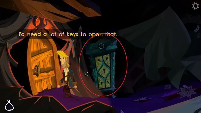 그런 다음 자물쇠 제조공 집에 들어갈 수 있습니다. 그 안에서 당신은 많은 열쇠, 자물쇠, 심지어 앵무새와 상호 작용할 수 있습니다! 자물쇠 제조공과 대화하기 전이나 후에 여기 에서 크래커 를 꼭 잡으세요 . 바닥에는 Trivia Card도 있는데 깔개 아래에서 거의 보이지 않습니다.